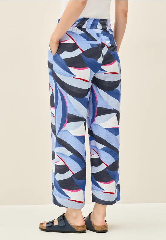 Deze twill broek van CECIL met een grafisch patroon en wijde pijpen zorgt voor een frisse wind in je garderobe. De High Waist en de tailleband met trekkoord zorgen voor een comfortabele pasvorm. Praktische zakken maken de look compleet.