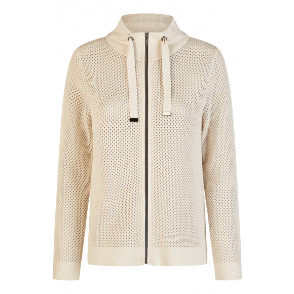 Vest van merk Barbara Lebek. Dit stijlvolle vest in een zachte ecru tint heeft een luchtige opengewerkte structuur die zorgt voor een verfijnde en moderne uitstraling. De ritssluiting en sportieve capuchon met trekkoorden geven het vest een casual touch, terwijl de fijne breikwaliteit zorgt voor comfort en elegantie.
