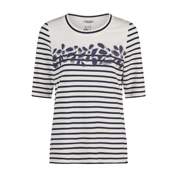 Dit t-shirt van Barbara Lebek heeft een niet al te diepe ronde hals en een mouwtje tot net boven de elleboog.