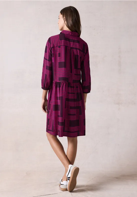 Deze bedrukte jurk van CECIL voor dames heeft prachtige details. De knielange jurk heeft een overhemdkraag met knoopsluiting en 3/4 mouwen met elastische manchetten. Een elastische band in de taille creëert een vrouwelijk silhouet, terwijl de zachte viscose zorgt voor draagcomfort.