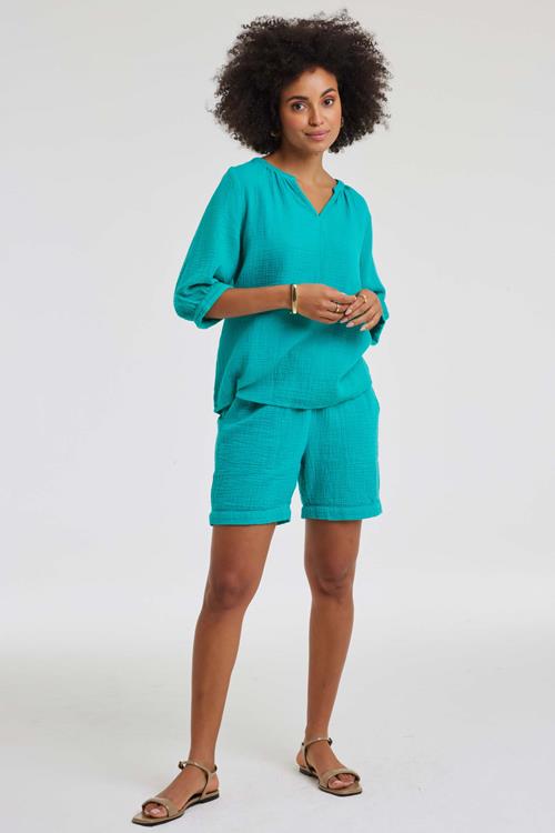 Stijlvolle Zomer Vibes met Bermuda Pietra Spectra Green Breng de frisse en luchtige sfeer van het seizoen in je garderobe met de Bermuda Pietra Spectra Green. Deze korte broek combineert stijl en comfort dankzij het gebruik van een elastische tailleband met koord. De groene kleur geeft je outfit direct een levendige uitstraling, perfect voor zonnige dagen. Gemaakt van Hoogwaardige Stof Deze Bermuda is gemaakt van 100% katoen, een natuurlijk materiaal dat bekend staat om zijn ademende en comfortabele eigenschappen. Katoen voelt zacht aan op de huid en is perfect om je koel te houden tijdens warme dagen. Het materiaal is duurzaam en behoudt zijn vorm, zelfs na veelvuldig wassen. Stijladvies De Bermuda Pietra Spectra Green is een veelzijdige toevoeging aan je garderobe. Combineer het met een leuke blouse voor een casual maar stijlvolle look. Of draag het met een simpele t-shirt en sneakers voor een relaxte dag. Wasvoorschrift Was instructie: Het is belangrijk om de Bermuda op 30 graden te wassen om de stof en kleur te behouden. Vermijd het gebruik van bleekmiddelen en chemische reiniging om de kwaliteit te waarborgen. Droogvoorschrift: Hang de korte broek aan de lucht om te drogen, vermijd het gebruik van een droger om krimpen te voorkomen. Strijkvoorschrift: Voor een optimale verzorging strijk je de Bermuda op lage temperatuur. Zo blijft de stof mooi en glad. Met de Bermuda Pietra Spectra Green voeg je een stijlvol en praktisch kledingstuk toe aan je collectie, ideaal voor die fijne zomerdagen.