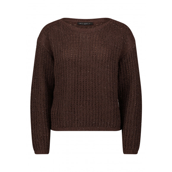 Trui van het merk Betty Barclay. Deze donkerbruine trui is gebreid in een grof, luchtig patroon. Het model heeft een comfortabele pasvorm en voelt zacht aan, ideaal om zowel casual als gekleed te dragen.