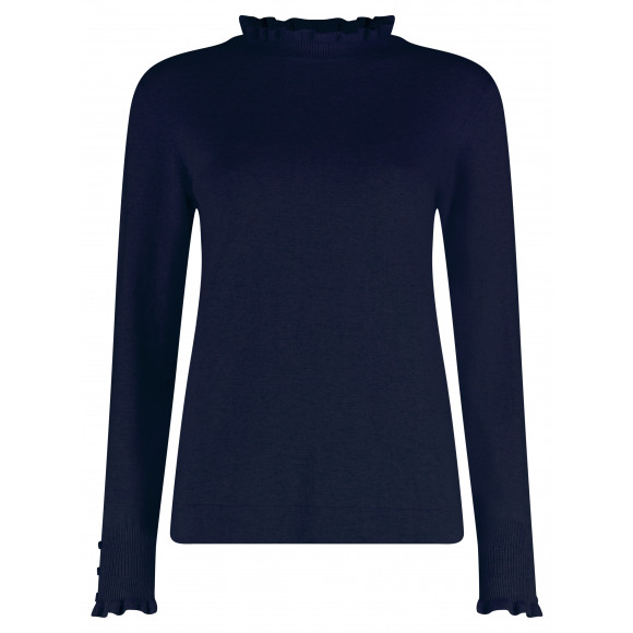 Truitje van Bloomings. Dit fijne truitje is gemaakt van een zachte katoenmix en heeft een opstaand kraagje met subtiele ruches. Ook de manchetten zijn afgewerkt met een speels ruffle detail en knoopjes, wat zorgt voor een vrouwelijke en elegante uitstraling. Een tijdloos basisstuk dat je eindeloos kunt combineren, van casual tot chic.