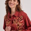 Blouse Conga Rust Red: Unieke Stijl en Comfort De Blouse Conga Rust Red is een must-have voor je kledingcollectie. Gemaakt voor degenen die houden van een opvallend stukje flair, biedt deze blouse een losse pasvorm die casual elegantie uitstraalt. De rijke rode kleur en unieke borduursels geven je outfit een speelse en modieuze uitstraling. De lange mouwen met print en de klassieke kraag maken het een perfecte keuze voor zonnige dagen waarin je je luchtig wilt voelen, maar toch stijlvol blijft. De knoopsluiting voegt een klassiek tintje toe aan het geheel. Gemaakt van hoogwaardige stof Deze blouse is vervaardigd van 100% katoen, een favoriet materiaal dat bekend staat om zijn ademende eigenschappen en duurzaamheid. Katoen houdt je koel en comfortabel tijdens warme dagen, terwijl het zacht aanvoelt op je huid. Bovendien is het gemakkelijk te onderhouden, zodat je langer van je kleding kunt genieten zonder je zorgen te maken over slijtage. Stijladvies De Blouse Conga Rust Red is veelzijdig en gemakkelijk te combineren met je garderobe. Draag deze blouse met een broek of een jeans voor een relaxte maar stijlvolle look. Perfect voor een dagje uit of een informele bijeenkomst, deze blouse voegt een unieke touch toe aan je outfit en zorgt ervoor dat je opvalt. Wasvoorschrift Was instructie: Om de kwaliteit van de blouse te behouden, was je deze op 30 graden. Katoen blijft het mooist als je het voorzichtig wast en niet blootstelt aan hoge temperaturen. Droogvoorschrift: Laat de blouse aan de lucht drogen. Vermijd het gebruik van een droger, zodat de stof mooi en in vorm blijft. Strijkvoorschrift: Mocht strijken nodig zijn, doe dit dan op een lage temperatuur om het katoen te beschermen en zijn glans te behouden. Met de Blouse Conga Rust Red voeg je een flair van kleur en stijl toe aan je kast. Combineer en draag het met plezier!