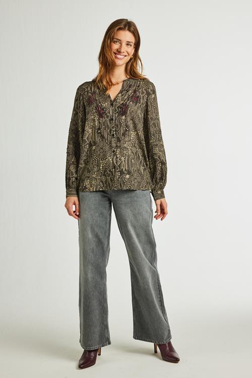 Elegantie van de Blouse Dolce Legacy Print Voeg een vleugje verfijning toe aan je kledingcollectie met de Blouse Dolce Legacy print. Deze prachtige blouse in zwart en grijs valt op door zijn stijlvolle lange mouwen en recht model, dat zowel comfortabel als flatterend draagt. De knoopsluiting en V-hals geven een klassieke uitstraling, terwijl de subtiele borduursels en details van laddertape een extra dimensie toevoegen. Perfect voor de koelere dagen, deze blouse brengt elegantie en warmte samen op een unieke manier. Gemaakt van hoogwaardige stof De Blouse Dolce Legacy print is vervaardigd uit 100% viscose, een materiaal dat bekend staat om zijn luxe en ademende eigenschappen. Deze stof voelt zijdezacht aan op de huid en biedt een lichte, vloeiende pasvorm, perfect voor elke gelegenheid. Viscose houdt de kleuren mooi en zorgt ervoor dat de blouse er langer als nieuw uitziet. Stijladvies Met de Blouse Dolce Legacy print creëer je moeiteloos stijlvolle outfits. Combineer deze blouse met een lekkere broek of een jeans voor een moderne, casual look. De kleuren en het dessin maken het eenvoudig om accessoires toe te voegen die bij je persoonlijke stijl passen. Ideaal voor zowel werk als een avondje uit. Wasvoorschrift Wasvoorschrift: Zorg ervoor dat je de blouse op 30 graden wast om de kwaliteit en kleur te behouden. Droogvoorschrift: Niet in de droger. Hang de blouse uit om natuurlijk te drogen, dit helpt om de vorm en de stof te bewaren. Strijkvoorschrift: Strijken kan op lage temperatuur. Dit houdt de blouse in perfecte staat en zorgt voor een netjes uiterlijk bij elke draagbeurt. Met de Blouse Dolce Legacy print voeg je een stijlvol en veelzijdig stuk toe aan je garderobe, perfect voor diverse gelegenheden en seizoenen.