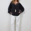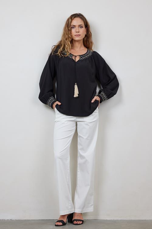 Elegantie Ontmoet Comfort: Blouse Grace in Black De Blouse Grace in black is jouw nieuwe favoriete kledingstuk voor de koelere maanden. Met een stijlvolle samensmelting van zwart en grijs brengt deze lange mouw blouse een verfijnd accent aan je dagelijkse outfit. Het rechte model in combinatie met de gesmockte manchetten zorgt voor een casual maar elegante uitstraling. De v-hals en contrast stiksels maken dit stijlvolle ontwerp compleet. De Blouse Grace in black past perfect bij de gevoelige ontspanning en gezelligheid van het seizoen, ideaal voor elke gelegenheid. Gemaakt van hoogwaardige stof Gemaakt van 100% viscose, biedt de blouse je uitstekende draagcomfort met een lichte en zachte touch. Viscose staat bekend om zijn ademende eigenschappen, waardoor het ideaal is voor lang gezellig dragen tijdens koudere dagen. Het materiaal zorgt er ook voor dat de blouse mooi valt, wat bijdraagt aan de perfecte pasvorm en uitstraling. Stijladvies De Blouse Grace in black is veelzijdig te combineren. Draag deze blouse op een stijlvolle manier met een lekkere broek of een casual jeans. Zo creëer je eenvoudig een look die zowel casual als elegant is. Perfect voor een dagje uit of een avond met vrienden! Wasvoorschrift Wassen: Om de kwaliteit van je blouse te behouden, was je deze het beste op 30 graden. Viscose vraagt om een zachte behandeling. Droogvoorschrift: Niet in de droger. Hang de blouse op om te drogen en behoud zo de elegante vorm en kleur. Strijkvoorschrift: Strijk de blouse op een lage temperatuur om de stof mooi en glad te houden. Met de Blouse Grace in black voeg je een veelzijdig en elegant stuk toe aan je kledingcollectie, perfect voor elk moment van het seizoen.