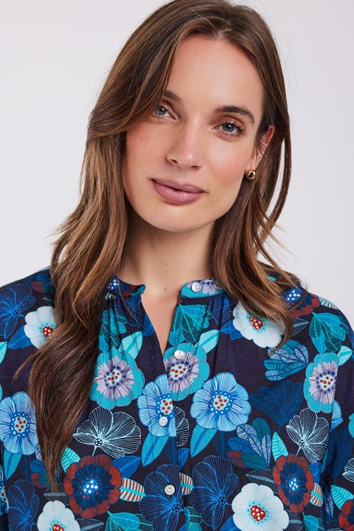 Stijlvol en tijdloos: Blouse Joy Blue Swing print Met de Blouse Joy Blue Swing print straal je elke dag weer! Deze blauwe blouse met korte mouwen is bedekt met een levendige bloemenprint die perfect past bij de luchtige en vrolijke dagen. Het regular fit model en de rechte pasvorm maken het een veelzijdig kledingstuk voor elke gelegenheid. De ronde hals en knoopsluiting geven een klassieke en toch moderne uitstraling die je garderobe opfrist. Combineer deze blouse en geef jezelf een energieboost voor de komende seizoenen. Gemaakt van hoogwaardige stof De Blouse Joy Blue Swing print is vervaardigd van 87% viscose en 13% nylon, wat zorgt voor een zachte en lichte textuur. Viscose staat bekend om zijn ademende kwaliteiten, wat ideaal is voor warme dagen, terwijl nylon bijdraagt aan de duurzaamheid en vormvastheid. De combinatie van deze materialen zorgt ervoor dat de blouse comfortabel is om te dragen, met een natuurlijke glans die je look net dat beetje extra geeft. Stijladvies Voor een frisse en moderne look kun je deze blouse combineren met een lekkere broek of een stijlvolle jeans. De levendige print maakt het gemakkelijk om de blouse zowel casual als chic te dragen. Of je nu een dagje uit gaat of een avondje uit eten, met de Blouse Joy Blue Swing print zit je altijd goed. Voeg wat accessoires toe voor een extra touch of hou het simpel voor een ingetogen uitstraling. Wasvoorschrift Wasinstructie: Wassen op 30 graden om de kleuren te behouden en de stof in optimale staat te houden. Droogvoorschrift: Niet in de droger om krimp en beschadiging van de stof te voorkomen. Strijkvoorschrift: Indien nodig, binnenstebuiten strijken op een lage temperatuur om de print en de stof te beschermen. Houd je aan deze eenvoudige richtlijnen om je blouse er fris en nieuw uit te laten zien, wasbeurt na wasbeurt.