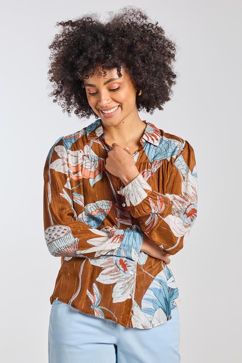 Blouse Sable Daydream print: Unieke Verfijning en Comfort Maak kennis met de Blouse Sable Daydream print, een perfecte balans tussen stijl en comfort. Deze blouse in zachte beige en bruine tinten straalt elegantie uit en is ideaal voor zonnige dagen en koele avonden. De lange mouwen, klassieke kraag en knoopsluiting geven een tijdloze charme, terwijl de regular fit en rechte pasvorm zorgen voor een comfortabele en flatterende look. De prachtige print met verfijnde details maakt deze blouse een waar statement piece in je garderobe. Gemaakt van hoogwaardige stof De Blouse Sable Daydream print is vervaardigd uit een luxueuze mix van 50% Modal, 44% Viscose en 6% Metalen vezels. Deze combinatie zorgt voor een zachte, ademende en duurzame stof die met je meebeweegt. Modal en viscose staan bekend om hun natuurlijke glans en soepele textuur, waardoor de blouse heerlijk aanvoelt op je huid. De toevoeging van metalen vezels zorgt voor een subtiele glinstering, wat een extra vleugje luxe toevoegt aan elke outfit. Stijladvies Met de Blouse Sable Daydream print kun je eindeloos combineren. Deze blouse is perfect te dragen met een lekkere broek of een casual jeans, voor zowel een alledaagse als chique uitstraling. Voeg eenvoudige accessoires toe om de elegante print te laten spreken en je persoonlijke stijl te onderstrepen. Wasvoorschrift Wasinstructie: Hou de kwaliteit van de blouse optimaal door deze binnenstebuiten te wassen op 30 graden. Dit zorgt ervoor dat de materialen hun vorm en zachtheid behouden. Droogvoorschrift: Vermijd de droger en laat de blouse plat of op een hanger drogen om krimp en beschadiging te voorkomen. Strijkvoorschrift: Voor een perfect glad oppervlak, strijk de blouse op een lage temperatuur. Dit helpt ook om de glans en glinstering van de stoffen te behouden. Met de Blouse Sable Daydream print voeg je een vleugje verfijning en luxe toe aan je dagelijkse stijl.