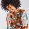 Blouse Sable Daydream print: Unieke Verfijning en Comfort Maak kennis met de Blouse Sable Daydream print, een perfecte balans tussen stijl en comfort. Deze blouse in zachte beige en bruine tinten straalt elegantie uit en is ideaal voor zonnige dagen en koele avonden. De lange mouwen, klassieke kraag en knoopsluiting geven een tijdloze charme, terwijl de regular fit en rechte pasvorm zorgen voor een comfortabele en flatterende look. De prachtige print met verfijnde details maakt deze blouse een waar statement piece in je garderobe. Gemaakt van hoogwaardige stof De Blouse Sable Daydream print is vervaardigd uit een luxueuze mix van 50% Modal, 44% Viscose en 6% Metalen vezels. Deze combinatie zorgt voor een zachte, ademende en duurzame stof die met je meebeweegt. Modal en viscose staan bekend om hun natuurlijke glans en soepele textuur, waardoor de blouse heerlijk aanvoelt op je huid. De toevoeging van metalen vezels zorgt voor een subtiele glinstering, wat een extra vleugje luxe toevoegt aan elke outfit. Stijladvies Met de Blouse Sable Daydream print kun je eindeloos combineren. Deze blouse is perfect te dragen met een lekkere broek of een casual jeans, voor zowel een alledaagse als chique uitstraling. Voeg eenvoudige accessoires toe om de elegante print te laten spreken en je persoonlijke stijl te onderstrepen. Wasvoorschrift Wasinstructie: Hou de kwaliteit van de blouse optimaal door deze binnenstebuiten te wassen op 30 graden. Dit zorgt ervoor dat de materialen hun vorm en zachtheid behouden. Droogvoorschrift: Vermijd de droger en laat de blouse plat of op een hanger drogen om krimp en beschadiging te voorkomen. Strijkvoorschrift: Voor een perfect glad oppervlak, strijk de blouse op een lage temperatuur. Dit helpt ook om de glans en glinstering van de stoffen te behouden. Met de Blouse Sable Daydream print voeg je een vleugje verfijning en luxe toe aan je dagelijkse stijl.