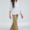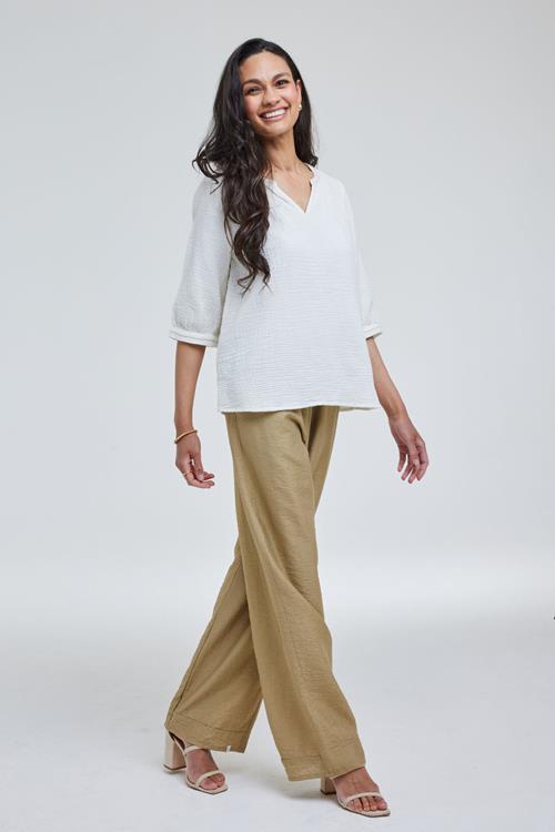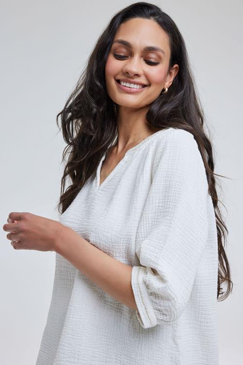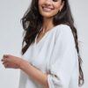 Tijdloze Elegant en Licht: Blouse Salina Offwhite De Blouse Salina Offwhite is jouw nieuwe favoriete item voor een frisse en lichte look. Met zijn driekwart mouwen en rechte pasvorm biedt deze blouse niet alleen stijl, maar ook comfort. De V-hals zorgt voor een subtiele elegantie, perfect voor zowel casual als formele gelegenheden. Het offwhite tintje maakt het een veelzijdige keuze, klaar voor zonnige dagen en zwoele avonden. Gemaakt van hoogwaardige stof Gemaakt van 100% katoen, biedt de Blouse Salina Offwhite je de ideale combinatie van ademend vermogen en zachtheid. Katoen staat bekend om zijn natuurlijke eigenschappen die ervoor zorgen dat je de hele dag koel en comfortabel blijft. Deze blouse is niet alleen stijlvol, maar ook praktisch, want het katoen maakt het wassen en verzorgen eenvoudig. Katoen is duurzaam en behoudt zijn vorm, zelfs na vaak dragen. Stijladvies De veelzijdigheid van de Blouse Salina Offwhite maakt het een onmisbaar item in je garderobe. Combineer deze blouse bijvoorbeeld met een lekkere broek of je favoriete jeans voor een moeiteloze en stijlvolle outfit. Of je nu gaat voor een casual uitje of een dag op kantoor, deze blouse past zich moeiteloos aan je plannen aan. Voeg subtiele sieraden toe voor een extra vleugje elegantie. Wasvoorschrift Wassen: Was de blouse op 30 graden om de kwaliteit van de katoen te behouden. Droogvoorschrift: Hang de blouse uit om te drogen en vermijd het gebruik van een wasdroger om krimp te voorkomen. Strijkvoorschrift: Strijk de blouse op een lage temperatuur voor een gladde finish en om de stof te beschermen. Volg deze eenvoudige stappen om de levensduur van je Blouse Salina Offwhite te verlengen en er keer op keer fantastisch uit te zien.