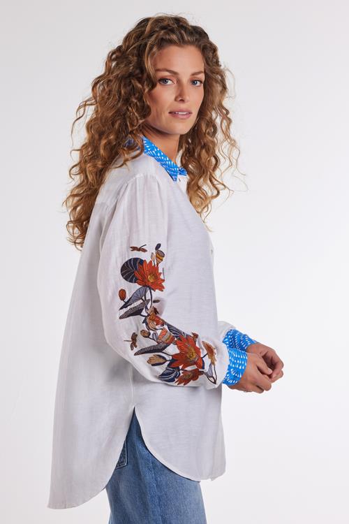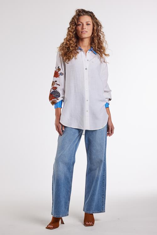 Tijdloze Elegant: Blouse Seaside Snow white De Blouse Seaside Snow white is de perfecte keuze voor een luchtige, stijlvolle look. Met haar regelmatige fit en rechte pasvorm biedt deze blouse langdurig comfort. De opvallende lange mouwen met kleurrijke borduursels voegen een speelse touch toe, terwijl de klassieke kraag en de knoopsluiting een chique uitstraling geven. Deze blouse in helder wit is de ideale metgezel voor een zonnige dag of een verfrissende avond. Gemaakt van hoogwaardige stof De blouse is vervaardigd uit 100% modal, een materiaal dat bekend staat om zijn zachtheid en duurzaamheid. Modal ademt uitstekend, wat het ideaal maakt voor warmere dagen. Daarnaast voelt het materiaal heerlijk soepel aan op de huid, waardoor je de hele dag geniet van comfort en stijl. Stijladvies Deze veelzijdige blouse kun je eenvoudig combineren voor verschillende gelegenheden. Draag haar met een lekkere broek of een spijkerbroek voor een casual, maar toch modieuze uitstraling. Of combineer met een nette rok en accessoires voor een meer verfijnde look. De veelzijdigheid van de Blouse Seaside Snow white maakt haar tot een onmisbare toevoeging. Wasvoorschrift Wasvoorschrift: Voor het behoud van de blouse was je haar het beste met de hand. Dit voorkomt schade aan de stof en behoudt de kwaliteit. Droogvoorschrift: Niet geschikt voor de droger. Laat liever aan de lucht drogen om de vorm en veerkracht van de blouse te behouden. Strijkvoorschrift: Strijk op lage temperatuur om de delicate vezels van modal intact te houden. Met de Blouse Seaside Snow white blijf je modieus en comfortabel, ongeacht de gelegenheid. Voeg deze elegante blouse vandaag nog toe aan je kledingcollectie!