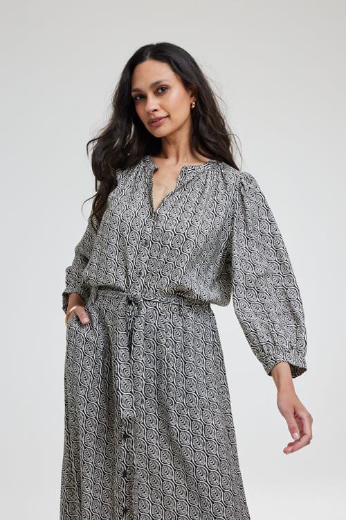 Tijdloze elegantie: Blouse Tale in Feather grey with Palette print De Blouse Tale in Feather grey with Palette print biedt tijdloze elegantie met een moderne twist. Deze dames blouse in zwart en grijs heeft een recht model dat comfortabel en stijlvol is. De lange mouwen en ronde hals zorgen voor een klassieke uitstraling, terwijl de knoopsluiting een praktisch detail toevoegt. Perfect voor de koelere dagen met zijn warme en gezellige uitstraling, biedt deze blouse veelzijdigheid en verfijning. Gemaakt van hoogwaardige stof Gemaakt van 85% viscose en 15% polyamide, biedt deze blouse niet alleen stijl maar ook kwaliteit. De combinatie van viscose en polyamide zorgt voor een zachte, ademende stof die tevens duurzaam is. Het materiaal valt soepel en behoudt zijn vorm, zodat je er steeds op je best uitziet zonder je zorgen te maken over kreuken. De lichte elasticiteit biedt extra draagcomfort en beweeglijkheid. Stijladvies Deze blouse kun je eindeloos combineren voor iedere gelegenheid. Of je nu kiest voor een ontspannen dagje uit of een professionele setting, hij valt altijd op. Draag hem met een lekkere broek of een goede jeans voor een complete look. Voeg daarbij minimalistische accessoires toe voor een extra verfijnde touch. Wasvoorschrift Wasvoorschrift: Was de blouse op maximaal 30 graden om de kwaliteit van de stof te behouden. Het gebruik van bleekmiddel wordt sterk afgeraden, om verkleuring of beschadiging te voorkomen. Droogvoorschrift: Vermijd de droger om de stof te beschermen. Laat de blouse liggend drogen om ongewenste rek te voorkomen. Strijkvoorschrift: Strijk op lage temperatuur als dat nodig is, om de delicate balans van viscositeit en polyamide te respecteren en de stof fris te houden. Met deze eenvoudige instructies blijft je blouse prachtig, keer op keer. Voeg de Blouse Tale in Feather grey with Palette print vandaag nog toe aan je collectie voor een vleugje tijdloze charme!