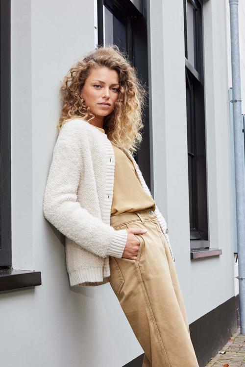 Cardigan Venus Ecru: Warm en Stijlvol Ervaar de perfecte combinatie van comfort en stijl met de Cardigan Venus Ecru. Deze rechte cardigan met lange mouwen biedt een warme en gezellige uitstraling, ideaal voor de koudere maanden. De knoopsluiting en ronde hals zorgen voor een klassieke touch, terwijl de prachtige witte kleur tijdloos en veelzijdig is. Gemaakt van hoogwaardige stof De Cardigan Venus Ecru is vervaardigd uit een luxueuze mix van 57% acryl, 29% polyamide, 7% viscose en 7% wol. Deze hoogwaardige samenstelling biedt de perfecte balans tussen zachtheid en duurzaamheid. Acryl en polyamide zorgen voor flexibiliteit en warmte, terwijl viscose en wol extra comfort en ademend vermogen toevoegen. Dit maakt de cardigan perfect voor elke gelegenheid waarbij je warmte en stijl wilt combineren. Stijladvies Deze veelzijdige cardigan laat zich prachtig combineren met verschillende outfits. Draag hem bijvoorbeeld met een heerlijke broek of jeans of kies voor een leuke blouse voor een meer geklede look. De Cardigan Venus Ecru biedt eindeloze mogelijkheden en is een stijlvolle aanvulling. Wasvoorschrift Wasvoorschrift: Om de kwaliteit van de Cardigan Venus Ecru te behouden, raden we aan deze met de hand of op een zacht programma te wassen. Gebruik koud water en milde wasmiddelen om de stof te beschermen. Droogvoorschrift: Laat de cardigan liggend drogen op een vlak oppervlak, weg van direct zonlicht. Dit voorkomt vervorming en houdt je kledingstuk in topconditie. Strijkvoorschrift: Mocht strijken nodig zijn, gebruik dan een lauwe strijkbout en strijk aan de binnenkant om de stof en kleur te behouden. Met de Cardigan Venus Ecru ben je verzekerd van een stijlvol en comfortabel kledingstuk dat perfect is voor elke gelegenheid.