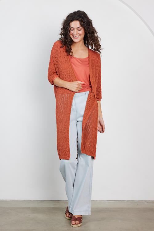 Cardigan Zita Bruschetta: Jouw Stijlvolle Must-Have Maak kennis met de Cardigan Zita Bruschetta, een perfect kledingstuk voor de zonnigere dagen. Deze lichtgewicht cardigan in een warme beige / bruine tint is een eyecatcher die je garderobe opfleurt zonder te overheersen. Met zijn korte mouwen en rechte pasvorm biedt deze cardigan een luchtige en comfortabele draagervaring. Dankzij het intrigerende opengewerkte breipatroon, straalt de Zita Bruschetta zowel eenvoud als verfijning uit, waardoor je moeiteloos stijlvol voor de dag komt. Gemaakt van hoogwaardige stof De Cardigan Zita Bruschetta is vervaardigd uit een blend van 80% katoen en 20% polyamide. Dit materiaal voelt niet alleen zacht aan op de huid, maar is ook ademend, waardoor het ideaal is voor de warmere maanden. Het katoen garandeert comfort en duurzaamheid, terwijl de polyamide zorgt voor voldoende flexibiliteit en vormvastheid. Deze combinatie maakt de cardigan gemakkelijk te onderhouden, zodat jij er elke keer weer fris uitziet. Stijladvies Deze cardigan laat zich prachtig combineren met een lekkere broek of jeans voor een casual look of met een leuke blouse voor een meer geklede uitstraling. Of je nu voor een avondje uitgaat of een dag op kantoor doorbrengt, de Cardigan Zita Bruschetta biedt je de veelzijdigheid die je zoekt in een kledingstuk. Wasvoorschrift Het wasvoorschrift: Voor de verzorging van je cardigan, was deze bij voorkeur op een fijnwasprogramma van maximaal 30 graden om de stof te beschermen. Droogvoorschrift: Liever niet in de droger, laat de cardigan liggend drogen voor het beste resultaat. Strijkvoorschrift: Indien nodig, strijk op een lage temperatuur om de cardigans hun vorm te laten behouden. Met deze tips blijft jouw Cardigan Zita Bruschetta als nieuw, klaar om elke dag opnieuw te stralen.