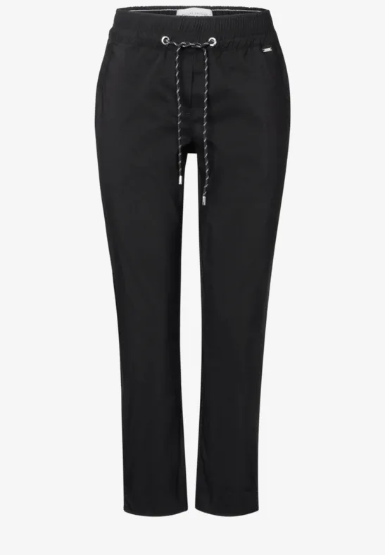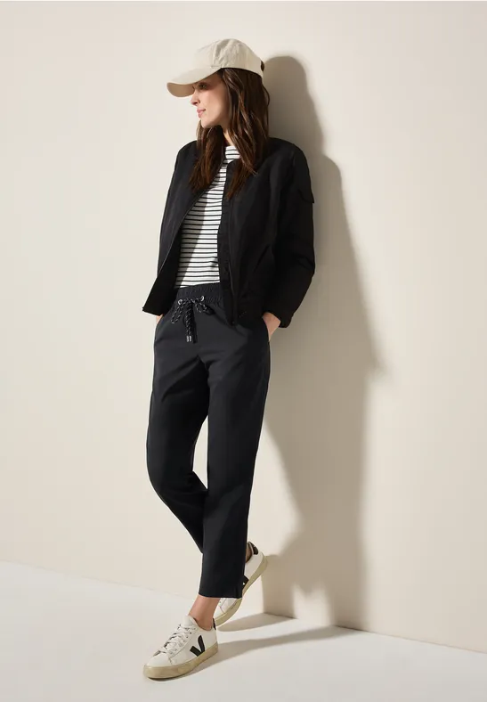 Deze damesbroek in Tracey-stijl van CECIL combineert een Mid Waist, Slim Legs en functionele ritszakken. De elastische tailleband met trekkoord en de zachte viscosemix met stretch zorgen ervoor dat deze broek het hele jaar door comfortabel zit.