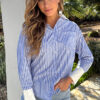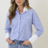 Deze blauwe blouse met strepen heeft een klassieke look met een opvallende contrastkraag en opvallende manchetten. De rechte pasvorm en frisse kleuren zorgen voor een stijlvolle, preppy uitstraling die perfect past bij zowel kantooroutfits als casual.Sizes: S/M and L/XL – Size s/m is suitable for ladies with size S(36) and M(38) – Size l/xl is suitable for ladies with size L(40) and XL(42) Fit: valt als normaalModel: 180 cm and wears size S/MDetails: lange mouwen, knoopsluiting and gestreept patroon Material: 100% KatoenWashing instructions: 30 graden wasmachineFor best results: niet in de droger, geen wasverzachter