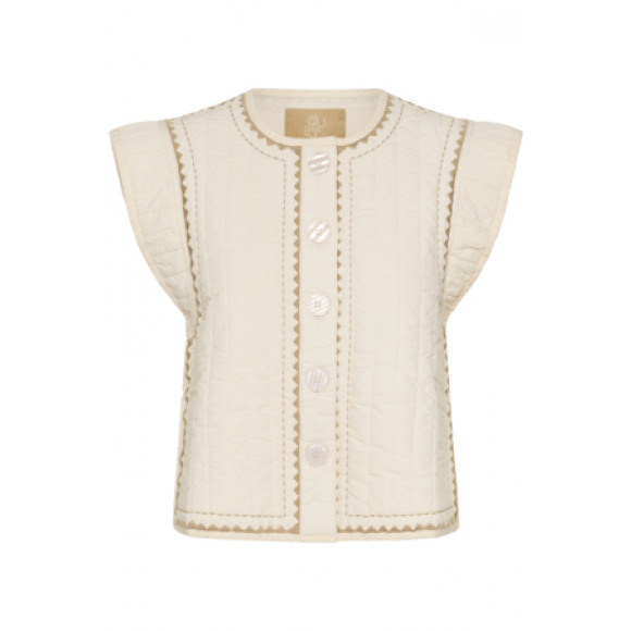 Gilet van Culture. Dit bijzondere gilet combineert een ambachtelijke uitstraling met een speelse, vrouwelijke touch. De doorgestikte kwaliteit in een zachte, naturel tint geeft het item een verfijnde look, terwijl de contrasterende sierstiksels zorgen voor een subtiel decoratief accent. De knoopsluiting aan de voorzijde maakt het gilet makkelijk draagbaar, maar de echte blikvanger is de kleurrijke borduursel op de rug, die het ontwerp een uniek en artistiek karakter geeft. Een statement piece dat elke outfit net dat beetje extra geeft.