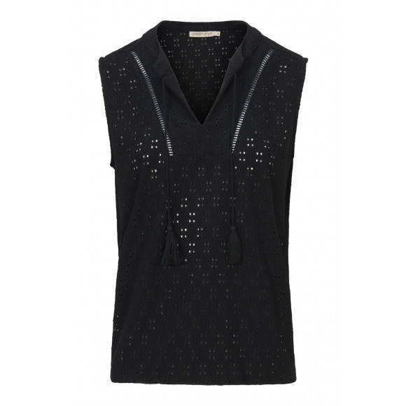 Mouwloze top met broderie op het voorpand van het merk Dreamstar. Deze top heeft een elastiekje onderin de boord en een v-hals met koordjes.