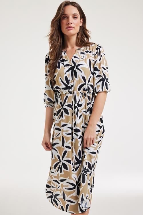 Verfrissende Elegantie met de Dress Jade Shade print Duik in de wereld van verfijnde stijl met de Dress Jade Shade print. Deze jurk straalt een moeiteloos elegante vibe uit die perfect past bij de warmte van het komende seizoen. De subtiele beige en bruine tinten combineren prachtig met het speelse patroon, waardoor je onweerstaanbaar opvalt. Met een rechte pasvorm en driekwart mouwen biedt deze jurk zowel comfort als moderniteit. De V-hals voegt een vleugje verfijning toe, ideaal voor zonnige dagen en frisse avonden. Gemaakt van hoogwaardige stof De Dress Jade Shade print is vervaardigd uit 100% viscose, een stof die uitblinkt in lichtheid en ademend vermogen. Deze hoogwaardige viscose voelt zijdezacht aan op je huid en valt mooi, waardoor je vrij kunt bewegen met een natuurlijk elegante uitstraling. De luchtige stof is ideaal om koel te blijven tijdens warme dagen, terwijl het toch een stijlvolle look behoudt. Stijladvies Deze jurk is veelzijdig genoeg voor verschillende gelegenheden. Combineer met elegante sandalen voor een ontspannen daglook of kies voor stijlvolle hakken en een clutch voor een avondje uit. Voeg een riem toe om je taille extra te accentueren of draag de jurk los voor een meer casual en vloeiende stijl. Deze jurk biedt eindeloze combinaties voor elke gelegenheid. Wasvoorschrift Wasvoorschrift: Om de kwaliteit van je Dress Jade Shade print te behouden, was je de jurk het beste met de hand op een lage temperatuur of kies voor een fijnwasprogramma. Droogvoorschrift: Raadpleeg de hangdroogmethode om de vorm en de stof van de jurk te beschermen. Vermijd direct zonlicht om verkleuring tegen te gaan. Strijkvoorschrift: Strijken kan indien nodig op een lage temperatuur. Voorzichtigheid is geboden om de print te behouden. De Dress Jade Shade print biedt alle ingrediënten voor een stijlvolle en comfortabele ervaring. Voeg deze must-have toe aan je garderobe en geniet van moeiteloze elegantie bij elke stap.