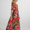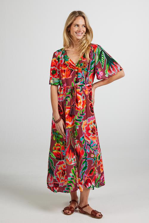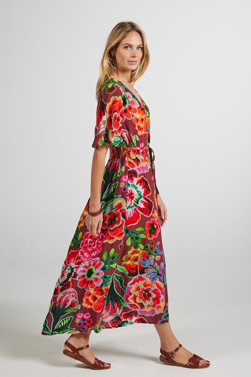 Ontmoet de Dress Jazzy Dark Fiesta print: Jouw Zomerse Statement De Dress Jazzy Dark Fiesta print is jouw geheime wapen voor een frisse en levendige look. Deze jurk straalt in een prachtige rode kleur die meteen de aandacht trekt. Het model is voorzien van een vrolijke bloemenprint, een kort mouwtje en een verfijnde V-hals. Dankzij de knoopsluiting creëer je een subtiele en sierlijke uitstraling, terwijl het taillekoordje zorgt voor een charmante pasvorm. Met een regular fit en rechte snit past deze jurk perfect bij elke zomerse gelegenheid. Gemaakt van hoogwaardige stof Deze jurk is vervaardigd uit 100% Rayon, een stof die bekend staat om zijn zijdezachte textuur en comfortabele draagervaring. Rayon is ademend en ideaal voor warme dagen, waardoor je koel blijft tijdens alle zomerse avonturen. Het soepele materiaal volgt moeiteloos je bewegingen, waardoor je je vrij en zelfverzekerd voelt. Stijladvies De Dress Jazzy Dark Fiesta print is veelzijdig te dragen. Combineer hem met sandalen voor een ontspannen dagje uit of voeg een paar elegante hakken toe voor een avondje uit. De kleurrijke print past perfect bij eenvoudige accessoires, waardoor je zonder veel moeite een complete look creëert. Wasvoorschrift Wassen: Voor het behoud van de prachtige kleuren en de kwaliteit, was deze jurk binnenstebuiten op 30 graden. Drogen: Laat de jurk aan de lucht drogen. Vermijd het gebruik van de droger om krimpen of beschadiging te voorkomen. Strijken: Strijk de jurk op een lage temperatuur om de stof glad en fris te houden, klaar voor je volgende avontuur. Met de Dress Jazzy Dark Fiesta print voeg je een vleugje vrolijkheid en stijl toe aan je garderobe, perfect voor zonnige dagen en zwoele avonden.