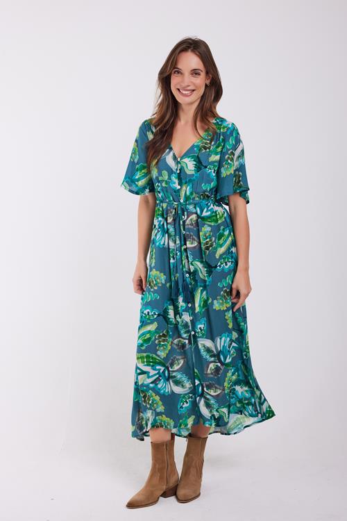 Dress Jazzy Sunbeam Print: Tijdloos en Stijlvol Maak kennis met de Dress Jazzy Sunbeam print, een must-have voor je zomerse garderobe. Deze groene jurk met korte mouwen en een regular fit zorgt voor een luchtige en stijlvolle uitstraling. De V-hals en het rechte model flatteren je figuur, terwijl de knoopsluiting en het taillekoordje een extra touch van elegantie toevoegen. Gemaakt van hoogwaardige stof Deze prachtige jurk is vervaardigd van 100% rayon, een materiaal dat bekend staat om zijn zijdezachte textuur en ademende eigenschappen. Het lichte en vloeiende materiaal zorgt ervoor dat je je zelfs op de warmste dagen comfortabel en fris voelt. Rayon valt mooi langs het lichaam en biedt optimale bewegingsvrijheid. Stijladvies De Dress Jazzy Sunbeam print is perfect te combineren met een paar elegante sandalen voor een casual, maar chique look. Voeg een stijlvolle zonnebril en je favoriete sieraden toe voor die extra glamour. Deze jurk is veelzijdig en past bij allerlei gelegenheden, van een dagje strand tot een zomers tuinfeest. Wasvoorschrift Wassen Om de kwaliteit en de kleur van de 100% rayon stof te behouden, was je de jurk op 30 graden. Dit behoudt de textuur en voorkomt krimpen. Droogvoorschrift Laat de jurk aan de lucht drogen en vermijd de droger om de stof en vorm te beschermen. Strijkvoorschrift Mocht je de jurk willen strijken, doe dit dan op een lage temperatuur voor het beste resultaat, zodat je gemakkelijk elke vouw wegwerkt zonder de stof te beschadigen. Kortom, de Dress Jazzy Sunbeam print is een veelzijdige aanvulling voor elke modebewuste vrouw die houdt van stijl en comfort.