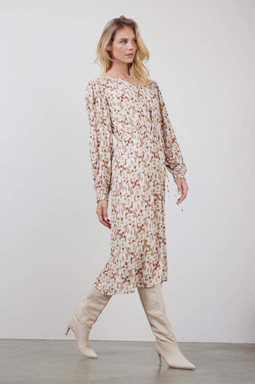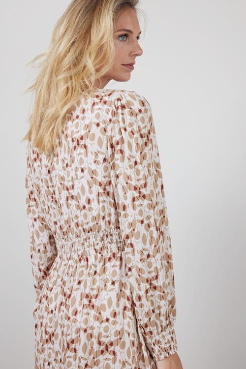 Stijlvol en uniek: Dress Jewel Ecru Happy leaves print De Dress Jewel Ecru Happy leaves print is een prachtige toevoeging aan je garderobe. Met zijn elegante V-hals en lange mouwen, biedt deze jurk de perfecte balans tussen stijl en comfort. De rechte pasvorm zorgt voor een soepele uitstraling, ideaal voor de koelere maanden waarin een warme en gezellige outfit gewenst is. De subtiele witgekleurde stof met bladrijke print geeft een natuurlijke charme die je outfit net dat beetje extra geeft. Gemaakt van hoogwaardige stof De jurk is vervaardigd uit 100% viscose, een stof die bekendstaat om zijn ademende en zachte eigenschappen. Viscose voelt comfortabel aan op de huid en valt mooi door zijn lichte gewicht. Dit maakt de jurk niet alleen elegant, maar ook praktisch voor dagelijks gebruik, waarbij het materiaal je een prettige draagervaring biedt. Stijladvies Combineer de Dress Jewel Ecru met een paar laarzen en een leuke tas voor een casual, maar stijlvolle uitstraling. Voeg een warme sjaal toe voor de koudere dagen. Deze veelzijdige jurk laat zich gemakkelijk stylen naar jouw smaak en is zowel geschikt voor een dagje uit als een avondje uit eten. Wasvoorschrift Wasvoorschrift: Was de jurk met zorg op een lage temperatuur om de kleur en stof te behouden. Een programma van 30 graden is ideaal. Droogvoorschrift: Laat de jurk liggend drogen. Vermijd de droger om krimp en beschadigingen te voorkomen. Strijkvoorschrift: Strijk de jurk binnenstebuiten op een lage temperatuur voor het beste resultaat. Zo blijft de delicate print mooi intact. Met de Dress Jewel Ecru Happy leaves print ben je voorbereid op elke gelegenheid, terwijl je geniet van de zachtheid en elegantie die deze jurk biedt.