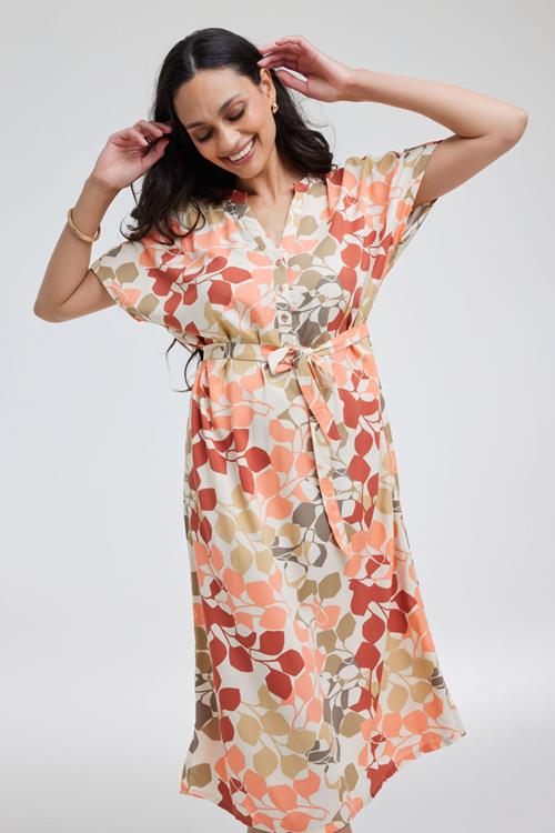 Dress Mauro Bright leaves print Stel je voor dat je op een zonnige dag de deur uitstapt in de Dress Mauro Bright leaves print. Deze jurk, met zijn frisse beige en bruine tinten, straalt energie uit met zijn levendige print. De korte mouwen en rechte pasvorm maken het perfect voor een luchtige en comfortabele look. Met een stijlvolle V-hals en een ceintuur met riemlussen, kun je de jurk eenvoudig aanpassen aan jouw voorkeur. De subtiele split voegt een speelse flair toe, waardoor deze jurk je nieuwe favoriet voor zonnige dagen wordt. Gemaakt van hoogwaardige stof De Dress Mauro Bright leaves print is gemaakt van 100% viscose. Deze natuurlijke en ademende stof voelt zijdezacht aan op je huid en biedt optimaal draagcomfort. Viscose is licht van gewicht en valt soepel en elegant, waardoor het een uitstekende keuze is voor warme dagen. De stof houdt je fris, zelfs tijdens de warmste momenten. Stijladvies Combineer deze veelzijdige jurk met een paar sandalen en subtiele sieraden voor een dagelijkse look. Wil je een avondje uit? Voeg dan een elegante clutch en je favoriete paar hakken toe. Het ceintuur accentueert je taille en geeft een extra accent aan je silhouet. Wasvoorschrift Wassen De jurk kan het beste gewassen worden op 30 graden om de kwaliteit van de viscose te behouden. Droogvoorschrift Vermijd het gebruik van de droger; laat de jurk liever aan de lucht drogen om de vezels te beschermen. Strijkvoorschrift Strijk de jurk op een lage temperatuur om de stof glad en netjes te houden. Geniet van het gemak en de stijlvolle uitstraling van de Dress Mauro Bright leaves print en maak van elke zonnige dag een modieuze belevenis.