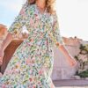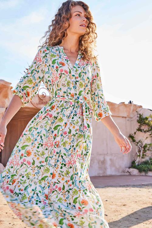 Dress Melody Marigold print: Vrouwelijke elegantie De Dress Melody Marigold print, uitgevoerd in een frisse witte tint met een levendige print, is de perfecte aanvulling voor je zomerse garderobe. Deze jurk combineert een rechte pasvorm met een elegante V-hals en driekwartsmouwen, waardoor hij ideaal is voor zowel casual als formele gelegenheden. De knoopsluiting en de bijpassende ceintuur met riemlussen zorgen voor een subtiele, maar stijlvolle afwerking. Stel je voor dat je in deze luchtige jurk door zonnige straten flaneert, terwijl je geniet van de zomerse warmte. Gemaakt van hoogwaardige stof Deze jurk is vervaardigd uit 100% viscose, bekend om zijn zijdezachte textuur en ademende eigenschappen. Dit natuurlijke materiaal zorgt ervoor dat je de hele dag door fris en comfortabel blijft, zelfs op de warmste dagen. Dankzij de hoge kwaliteit van de viscose behoudt de Dress Melody Marigold print zijn vorm en levendigheid, was na was. Stijladvies Combineer de Dress Melody Marigold print met sandalen voor een relaxte look of draag hem met hakken en opvallende sieraden voor een avondje uit. De veelzijdige V-hals biedt ruimte voor een stijlvolle ketting, terwijl de ceintuur je figuur subtiel accentueert. Deze jurk is een veelzijdige must-have die je elke keer anders kunt stylen. Wasvoorschrift Wassen: Om de kwaliteit en zachtheid van de viscose te behouden, was de jurk op 30 graden. Vermijd het gebruik van bleekmiddelen om de kleuren levendig te houden. Drogen: Hang de jurk op om te drogen. Zo voorkom je krimpen en blijft de vorm van de jurk behouden. Strijken: Strijk op een lage temperatuur om kreuken te verwijderen en de stof glad te maken, zonder deze te beschadigen. Haal de zomer in huis met de Dress Melody Marigold print en voel je stijlvol en zelfverzekerd het hele seizoen door.