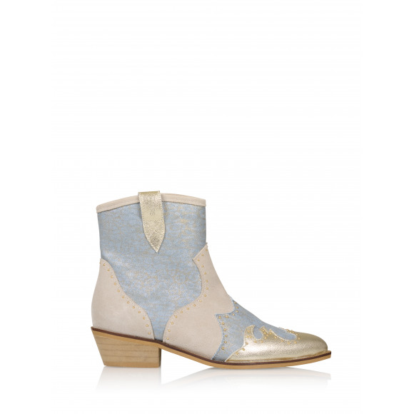 Enkel westernlaarsje met denim accenten van het merk DWRS, Dit laarsje heeft een hakje van 3,5 cm hoog, en is aan de binnenkan van leer en aande buitenkant van suede en denim. Super gaaf laarsje onder een wide leg jeans of onder bijvoorbeeld een rokje.
