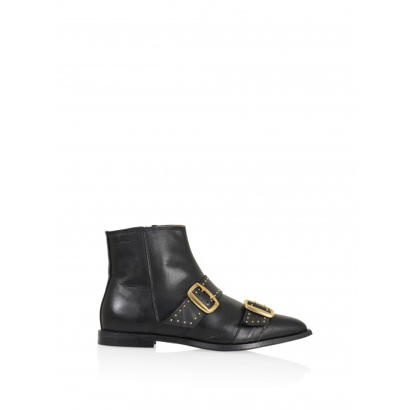 Boots van het merk DWRS. Deze zwarte enkellaarsjes zijn een stoere en stijlvolle toevoeging aan je garderobe. Gemaakt van leer en afgewerkt met goudkleurige gespen en subtiele studs, geven ze elke outfit een edgy twist. De platte zool zorgt voor ultiem draagcomfort, terwijl de spitse neus en strakke afwerking zorgen voor een verfijnde look.