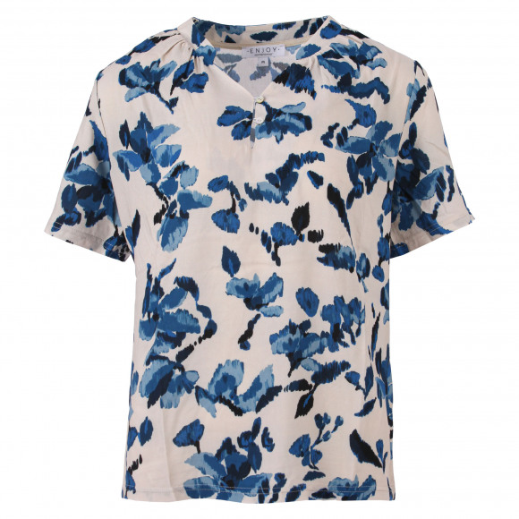 Blouse met korte mouwtjes van het merk Enjoy. Deze blouse heeft een v-hals met knoopje en een leuke frisse allover bloemenprint.