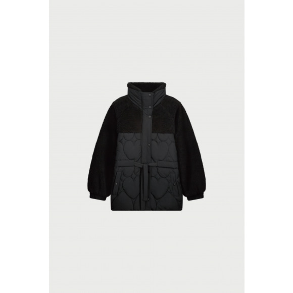 Jas van het merk Fabienne Chapot. Deze zwarte jas combineert stijl en comfort dankzij de mix van gewatteerde stof met speels hartjespatroon en zachte teddy-details op de mouwen en schouders. De hoge kraag en bijpassende ceintuur zorgen voor extra warmte en een mooie pasvorm. Voorzien van handige drukknoopsluiting en ruime zakken.