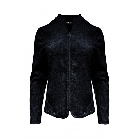 Jasje van het merk Frank Walder. Dit elegante, donkerblauwe jasje heeft een subtiele glans in de stof, wat zorgt voor een luxe uitstraling. Het model is voorzien van een ronde hals, lange mouwen en een ritssluiting aan de voorzijde. De licht getailleerde pasvorm geeft het jasje een vrouwelijk silhouet, terwijl de afgeronde zoom een speels detail toevoegt.
