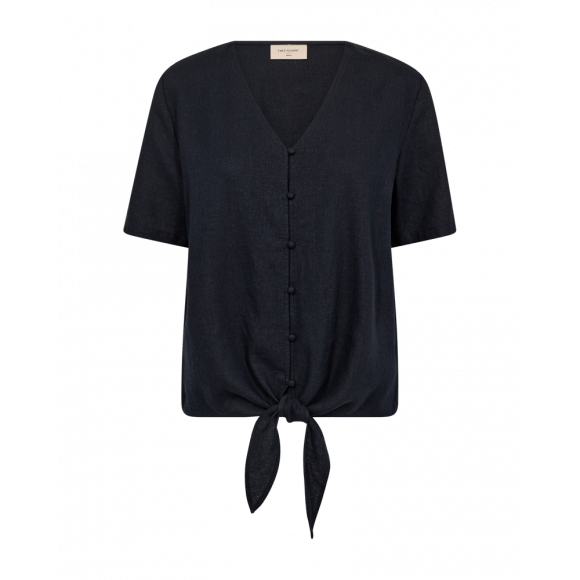 Effen blouse van het merk Freequent. Deze blouse heeft een strikje onderaan, korte mouwen, een v-hals en knoopsluiting.