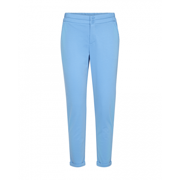 Tricot aangesloten broek van het merk Freequent. De broek heeft een half elastiche boord en daardoor extra comfortabel. Lengte: +/- 30 inch. Leuk om enkelvrij te dragen met een sneaker. Draag je er een enkellaarsje bij dan valt de broek precies op het laarsje.