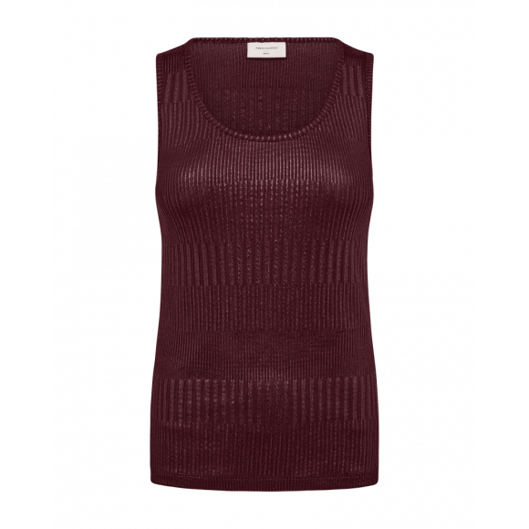 Top van het merk Freequent. Deze mouwloze top heeft een elegante, licht glanzende ribstructuur die zorgt voor een vrouwelijke en feestelijke uitstraling. De flatterende ronde hals en de aansluitende pasvorm maken dit item perfect om solo te dragen of als gelaagde look onder een blazer of vest.