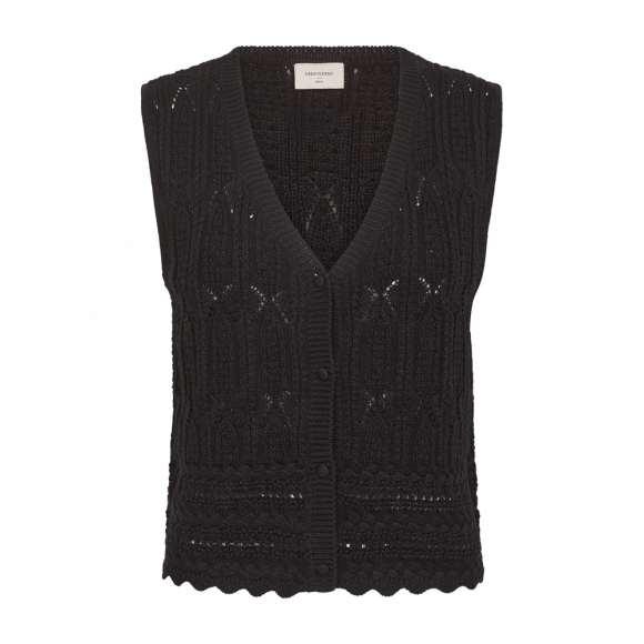 Gehaakt gilet van het merk Freequent. Dit gilet heeft een v-hals, knoopsluiting en schulprandje onderaan.