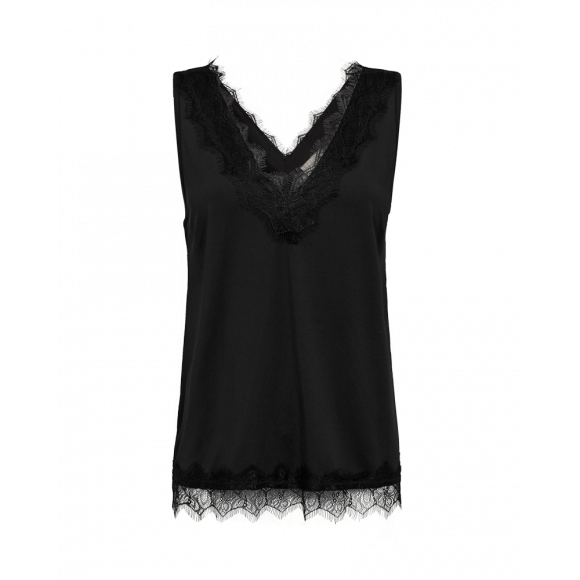 Top van het merk Freequent. Deze mouwloze top heeft een elegante V-hals en is afgewerkt met verfijnd kant langs de halslijn en zoom. De soepele stof zorgt voor een comfortabele pasvorm met een vrouwelijke uitstraling. Verkrijgbaar in meerdere kleuren: zwart, crème en bordeaux.