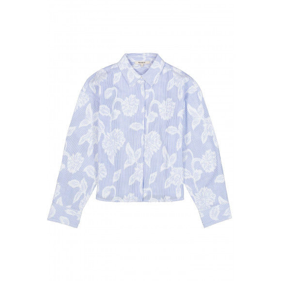 Blouse van Garcia. Deze frisse blouse met blauw-witte streep en een mooie bloemprint is zo’n item dat je outfit meteen een lichte, zomerse uitstraling geeft. Het model heeft een relaxte fit en valt wat korter, waardoor je ‘m perfect kunt dragen op een high waist jeans of pantalon. De klassieke kraag en knoopsluiting geven de blouse een nette touch, terwijl de print juist zorgt voor dat speelse, vrouwelijke effect.