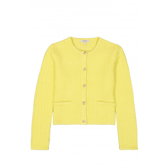 Leuk gebreid vestje van het merk Garcia. Dit gebreide vestje in een vrolijke gele kleur is de perfecte zomerse toevoeging aan je outfit. Het heef een ronde hals, lange mouwen en knoopsluiting.