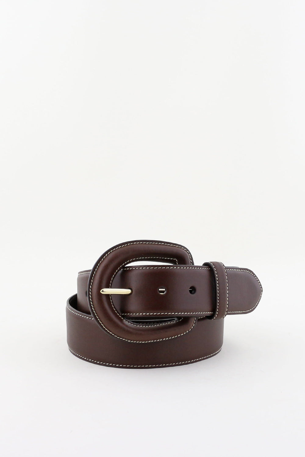 De leren riem Aloe bruin van Gavazzeni heeft een sterke, brede vorm die direct de aandacht trekt door de grote ovale gesp. Deze gesp is volledig bekleed in hetzelfde diepe bruine leer, t.moro genoemd, wat de riem een rustige eenheid geeft. De contrasterende witte stiksels langs de randen benadrukken het Italiaanse handwerk en geven het ontwerp een levendige uitstraling zonder te overdrijven. Het leer voelt stevig aan en behoudt goed zijn vorm, zoals je van degelijk vakmanschap mag verwachten. Gavazzeni maakt hun riemen met de hand in Italië, met oog voor materiaal en afwerking. Voor een mooie combinatie draag je de Aloe riem samen met de Gavazzeni riem Gloriosa CA01034532 tan, voor een subtiel kleurverschil binnen dezelfde lijn.