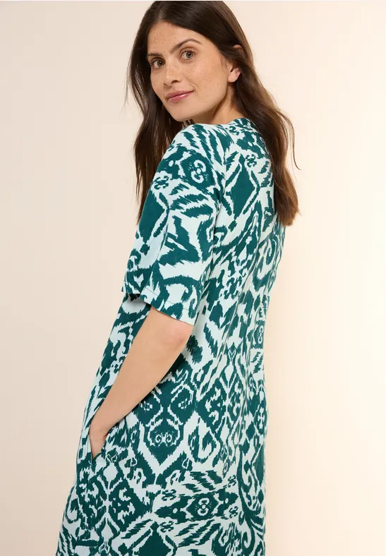 De gedessineerde midi-jurk van CECIL voor dames brengt zomerse lichtheid in je garderobe. De vloeiende linnenmix, V-hals en zijsplitten zorgen voor een luchtig gevoel. De doorlopende knoopsluiting rondt de look in stijl af.