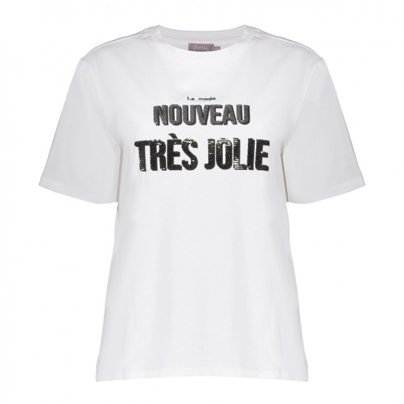 T-shirt van het merk Geisha. Dit witte T-shirt heeft een opvallende tekstprint met glinsterende pailletten in zwart: “La mode nouveau, très jolie”. De rechte pasvorm en het zachte katoen zorgen voor een comfortabele fit met een trendy twist.