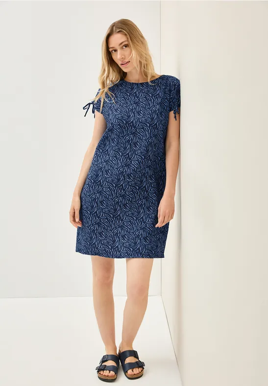 Deze knielange jurk van CECIL voor dames heeft een grafisch dessin en een aangename structuur. De ronde halslijn en korte mouwen met lintdetail zorgen voor een vrouwelijke touch. Een comfortabel en stijlvol stuk voor elke dag.