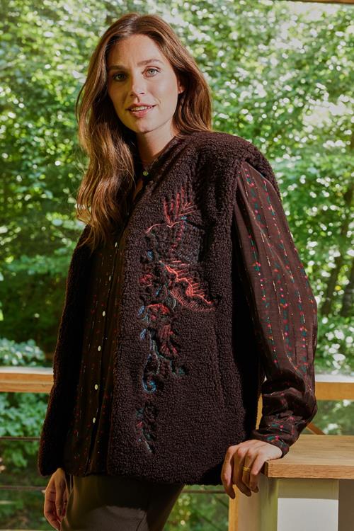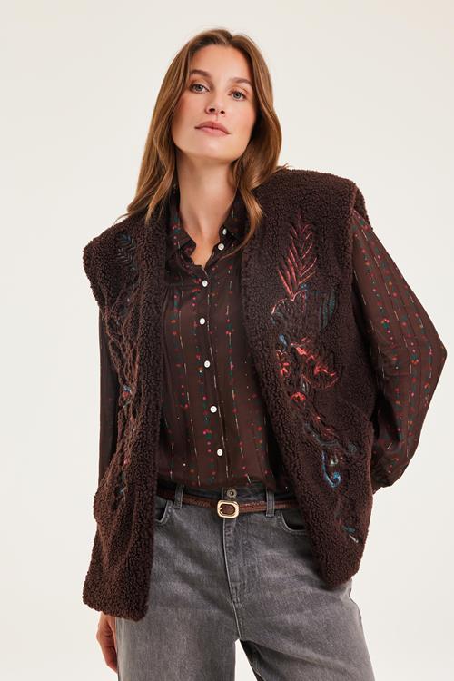 Gilet Charm Chocolate brown: Jouw Perfecte Stijlstatement De Gilet Charm Chocolate brown is een absolute must-have voor wie houdt van verfijnde eenvoud gecombineerd met een vleugje elegantie. De kleuren beige en bruin geven dit gilet een warme uitstraling, bijzonder geschikt voor de gezelligheid van de koudere dagen. De mouwloze constructie en rechte pasvorm maken het tot een veelzijdig stuk dat moeiteloos combineert met je garderobe. De subtiele borduursels voegen een uniek detail toe dat het gilet net dat beetje extra geeft waardoor je altijd indruk maakt. Gemaakt van hoogwaardige stof Dit gilet is vervaardigd van 100% polyester, een materiaal dat zowel lichtgewicht als duurzaam is. Het biedt uitstekende bescherming tegen de elementen zonder dat het zwaar aanvoelt, perfect voor die koelere dagen waarop je extra warmte nodig hebt. Polyester staat bekend om zijn kleurvastheid en kreukbestendigheid, waardoor je er altijd op je best uitziet, ongeacht hoe vaak je het draagt. Stijladvies De Gilet Charm Chocolate brown is ideaal voor een stijlvolle en verzorgde look. Combineer het met een lekkere broek of je favoriete jeans voor een nonchalante maar toch verfijnde uitstraling. De warme tinten van het gilet maken het een perfecte match met zowel neutrale als meer kleurrijke outfits, en zorgen ervoor dat je altijd straalt, ongeacht de gelegenheid. Wasvoorschrift Wassen: Om de kwaliteit van je gilet te behouden, adviseren we te wassen op 30 graden. Vermijd het gebruik van bleekmiddelen om de kleuren levendig te houden. Droogvoorschrift: Het gilet is niet geschikt voor de droger. Laat het rustig aan de lucht drogen voor het beste resultaat. Strijkvoorschrift: Mocht je het gilet willen strijken, doe dit dan op een lage temperatuur om het materiaal te beschermen en die strakke look te behouden. Met deze richtlijnen geniet je langdurig van de tijdloze elegantie van de Gilet Charm Chocolate brown.