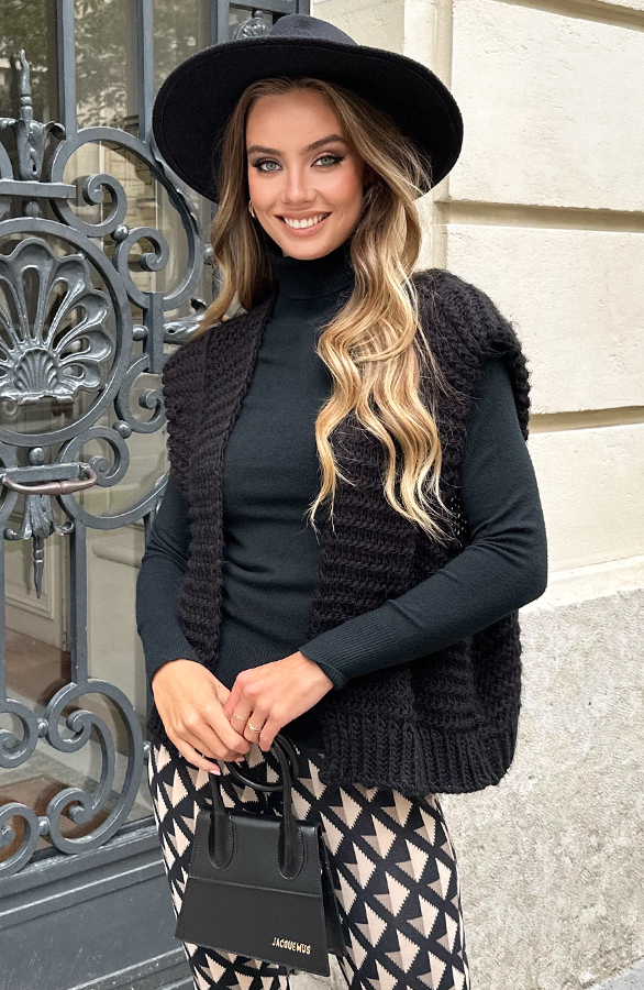 Dit zwarte gilet mag niet ontbreken in jouw garderobe! Het gilet maakt jouw look helemaal af!Sizes: ONE SIZE, suitable for ladies with sizes S(36), M(38), L(40) Fit: valt als normaalModel: 180 cm and wears size One SizeDetails: gebreid and enkel open te dragenMaterials: 15% Polyester, 10% Wol, 75% AcrylWashing instructions: handwas