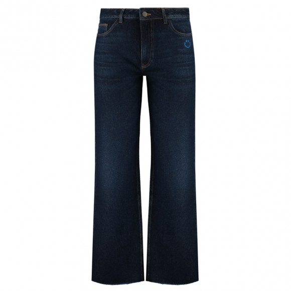 * Details: donkerblauwe wassing, contrasterende stiksels, geborduurd smiley detail, vijf-pocket model