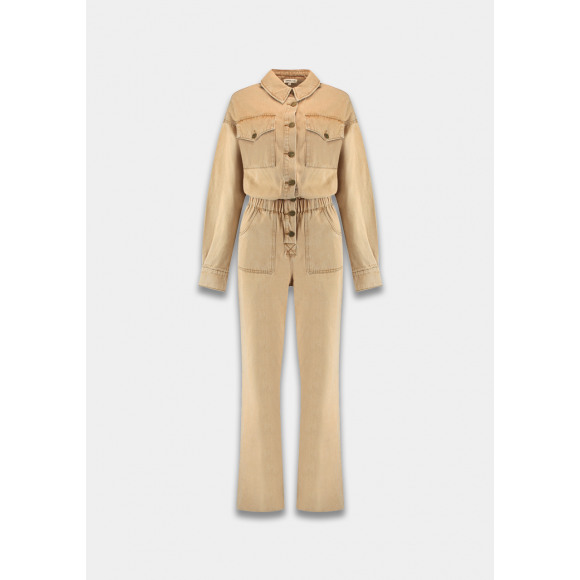 Jumpsuit van het merk Harper & Yve. Deze zandkleurige denim jumpsuit is een stoere en stijlvolle keuze voor elke dag. Het model heeft een kraag, lange mouwen en klepzakken op de borst voor een casual, utility look. De taille is voorzien van een elastische band met strikkoord, waardoor de pasvorm mooi geaccentueerd wordt. De rechte pijpen geven het geheel een relaxte uitstraling.