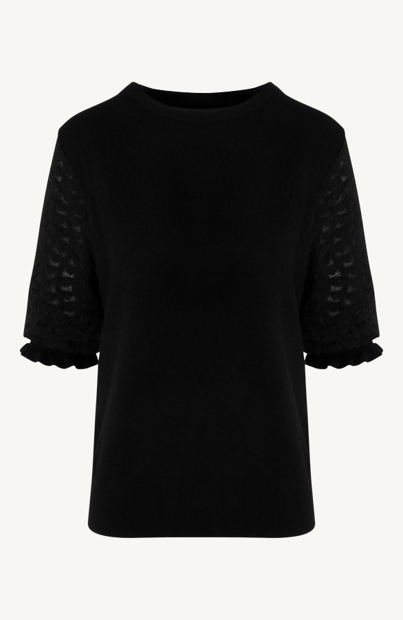 Comfort ontmoet cute! Dit heerlijk zachte zwarte t-shirt met ronde hals en korte mouwen, afgewerkt met schattige mesh hartjes, laat jou de hele dag stralen in stijl.Sizes: ONE SIZE, suitable for ladies with sizes S(36), M(38), L(40) Fit: valt als normaalDetails: ronde hals, korte mouwen and zachte stof Materials: 35% Polyamide, 15% Modal, 10% Elastaan, 40% ViscoseWashing instructions: 30 graden wasmachineFor best results: niet in de droger, geen wasverzachter