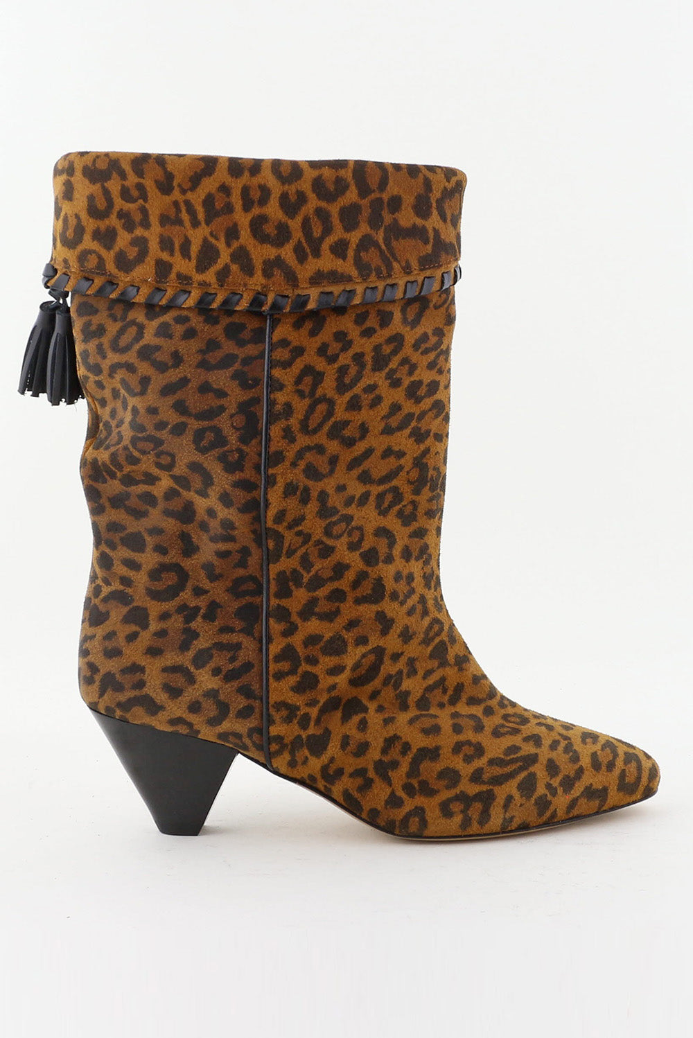 Dit zijn de Laarzen Dalby leopard van Isabel Marant, met een opvallende luipaardprint die direct het silhouet versterkt. Het zachte suede vormt zich soepel rond de voet en laat de omslag met gevlochten detail mooi uitkomen. De kwastjes geven een licht speels effect langs de schacht. De schuin aflopende hak heeft een driehoekige vorm die de laars een heldere lijn geeft. Ze vallen een maat kleiner, dus een maat groter kan prettiger zitten. Het ontwerp past helemaal bij de vrije stijl van Isabel Marant, met aandacht voor vorm en materiaal.